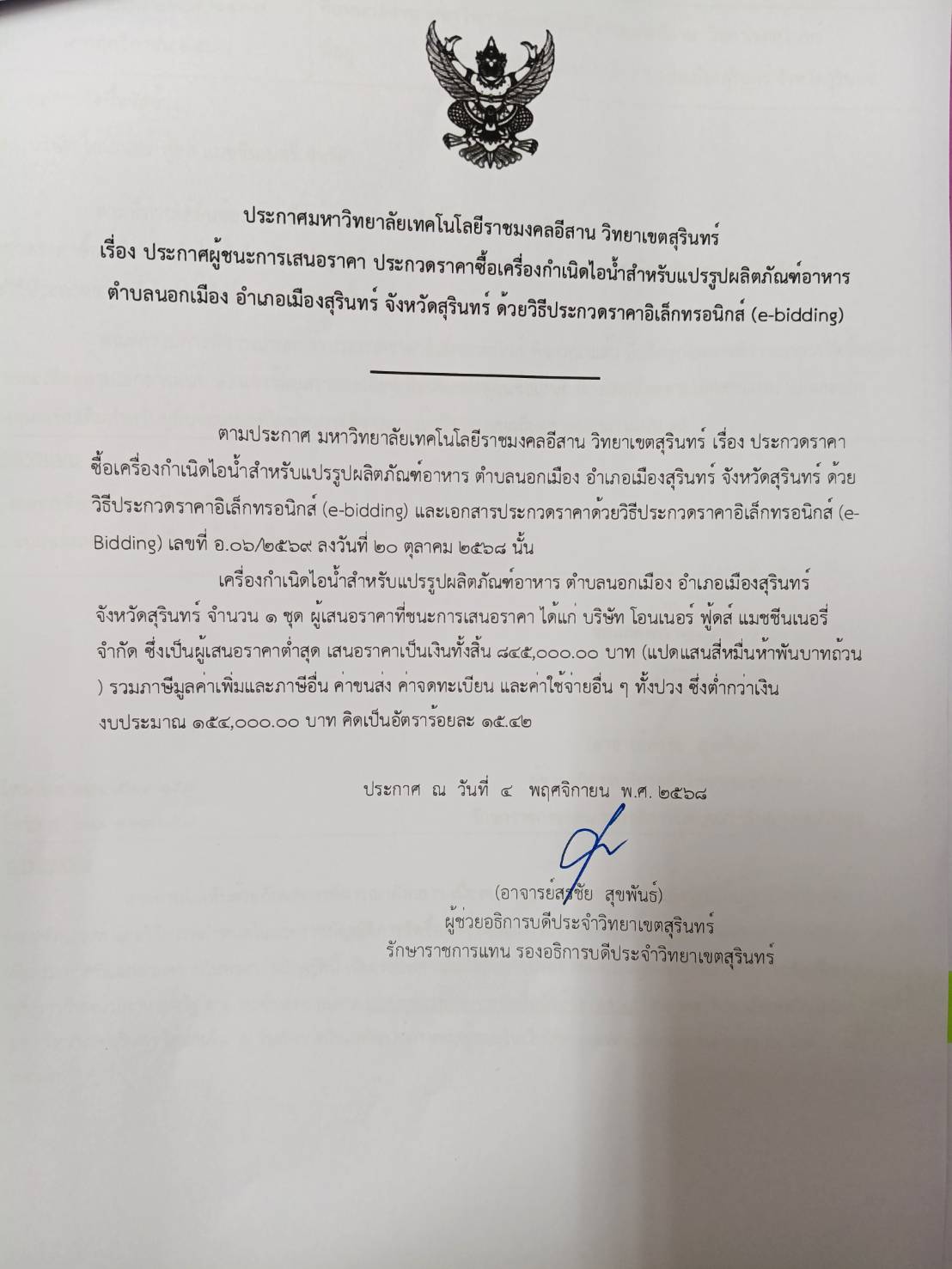 ประกาศผู้ชนะการเสนอราคา ประกวดราคาซื้อเครื่องกำเนิดไอน้ำสำหรับแปรรูปผลิตภัณฑ์อาหาร ตำบลนอกเมือง อำเภอเมืองสุรินทร์ จังหวัดสุรินทร์ ด้วยวิธีประกวดราคาอิเล็กทรอนิกส์ (e-bidding)